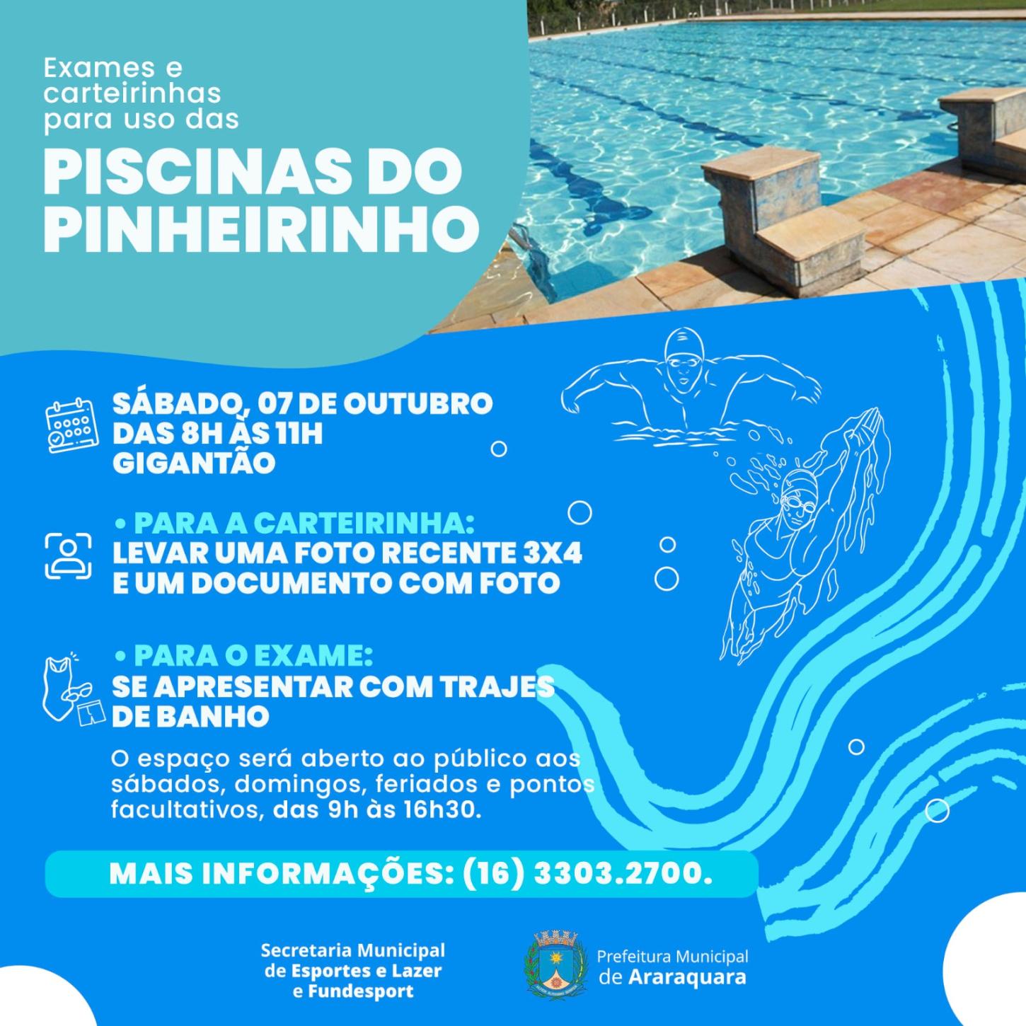 Neste sábado (7), das 8 às 11h, no Ginásio do Gigantão, a Prefeitura de Araraquara, por meio da Secretaria Municipal de Esportes e Lazer, fará gratuitamente a carteirinha e o exame médico para a utilização do complexo aquático do Parque Pinheirinho.
