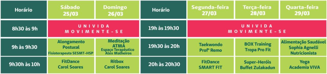 As atividades, que são para toda a família, acontecem no sábado e domingo, das 8h30 às 10h, e de segunda a quarta-feira, das 19h às 20h30. No cardápio, estão previstas aulas de alongamento, fitdance, ritbox, box training, meditação e apresentação de super-heróis. Também serão compartilhadas dicas de saúde e alimentação saudável, bem como sorteio de brindes. O SOS Unimed garante o suporte aos participantes.